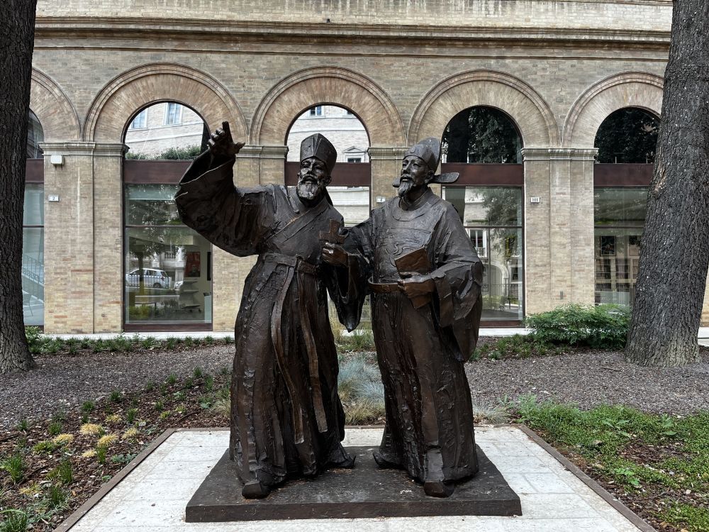 当他接近这群铜雕雕塑超过两米时,我们可以看到Matteo富有儒家制服,仿佛他说了一只手。雕刻旁边的解释卡用意大利语,中文和英语阅读。十七世纪的这两个贤哲为中国和欧洲文明之间的相互学习建立了先例,将它们握住并指向正确的方向。