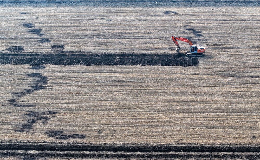 2025年3月11日,在天津市津南区八里台镇大韩庄村,工人们操作挖掘机进行高等级农田建设作业(无人机照片)。图片提供:新华社记者赵子硕。